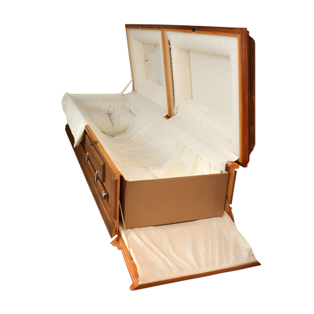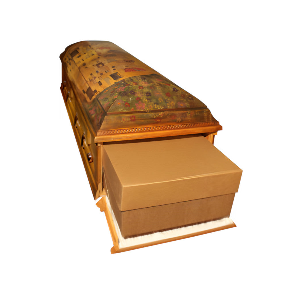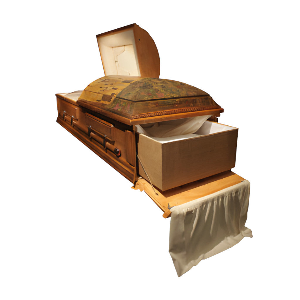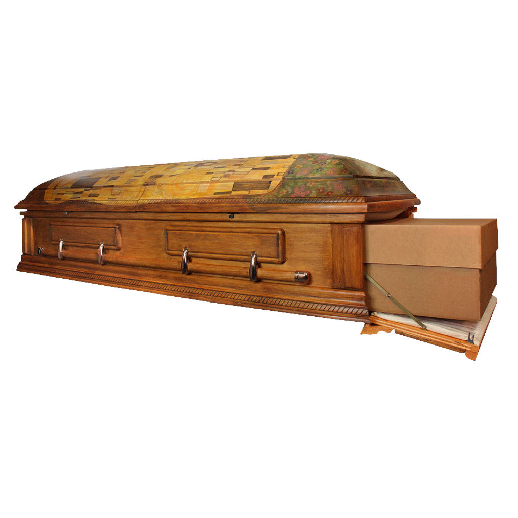 Ataúd de madera para cremación, reutilizable, pintado a mano con la reproducción de la pintura “El Beso” de Gustave Klimt.
